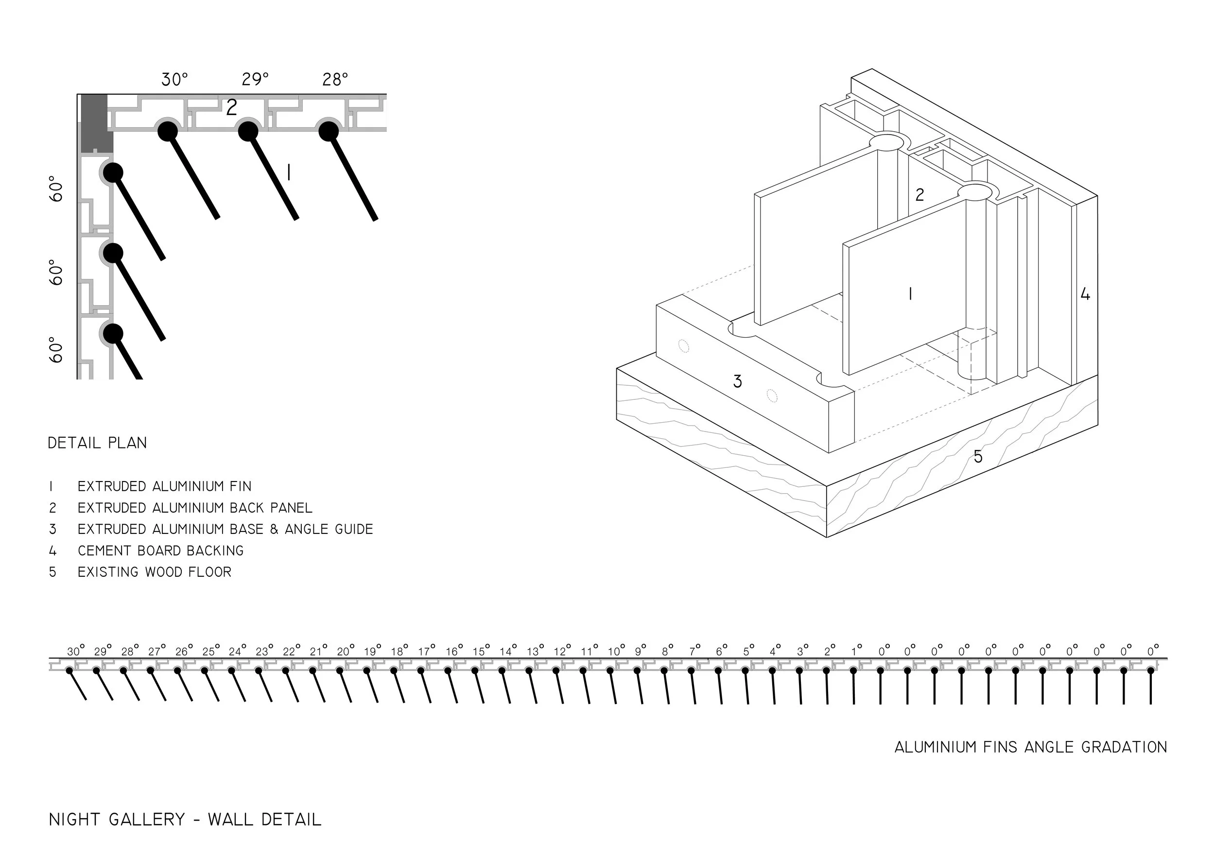 The wall of the ‘Night’ gallery is mounted with vertical midnight-blue aluminum fins where each of the fins’ rotation can be individually steered and fixed to reveal the gradation of white stripes carefully positioned to accentuate the midnight glow of the finale ball gowns.